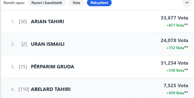 Tahirit iu shtuan 877 vota, kurse pas tij Uran Ismailit iu shtuan 712 vota dhe Përparim Grudës 510 vota.