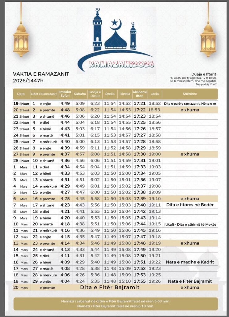 Besimtarët e fesë Islame do të nisin agjërimin në muajin shkurt, teksa është publikuar vaktia e Ramazanit.